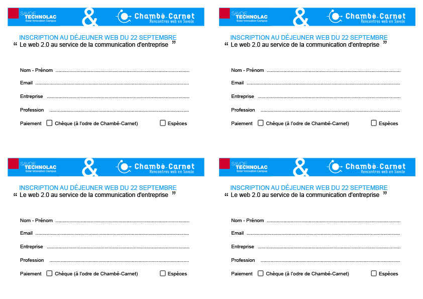 Hello, on vient d'ouvrir les inscriptions : http://www.chambe-carnet.com/2011/08/25/comment-utiliser-le-web-2-0-au-servi... N'hésitez pas à en parler autour de vous. Si des personnes sont interessées pour s'inscrire, elles peuvent le faire directement depuis un formulaire papier à remplir et en remplissant un cheque de 10€ à l'ordre de chambé-carnet. Je vous joint le formulaire. Pour info, on a retenu savoie saveurs comme presta pour le buffet. ++ -- Jean-Sébastien Mansart Président de l'association Chambé-Carnet http://chambe-carnet.com http://facebook.com/chambecarnet http://twitter.com/chambecarnet